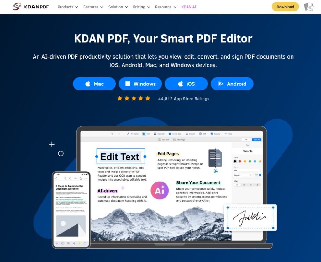KDAN PDF(formerly KDAN PDF Reader) is a cross-platform PDF solution available on iOS, Android, macOS, and Windows. It is designed to meet the needs of both professionals and everyday users by combining strong editing tools with mobile flexibility. Unlike many PDF tools that focus only on desktop, KDAN emphasizes a mobile-first experience while still providing comprehensive features for desktop workflows.